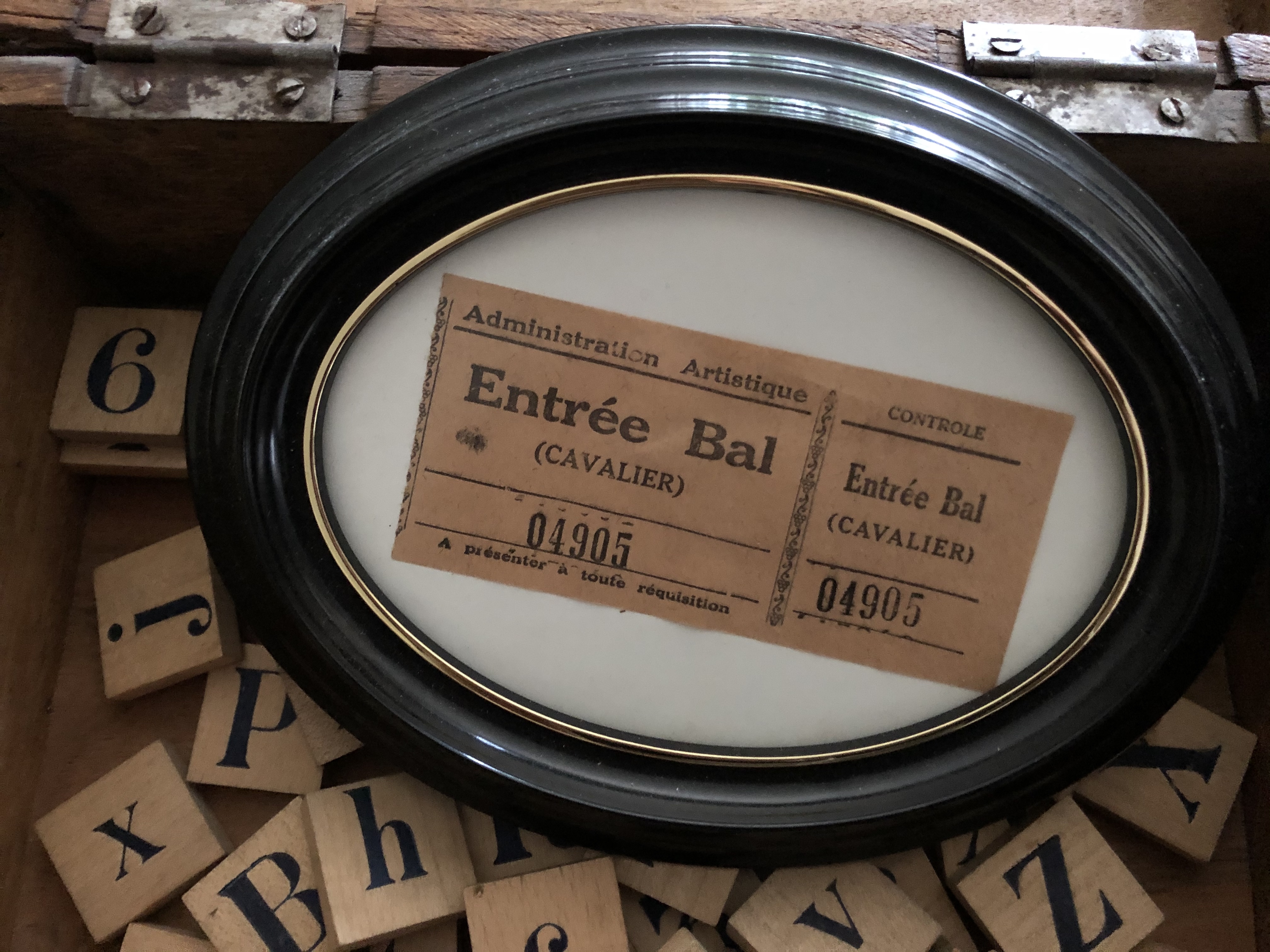 Ce petit cadre ovale est scandinave, il est noir bordé d’un liseré or, à l’intérieur j’y ai glissé un ticket de bal vintage. Très déco sur un mur blanc en accumulation avec d’autres petits camarades de différentes tailles.