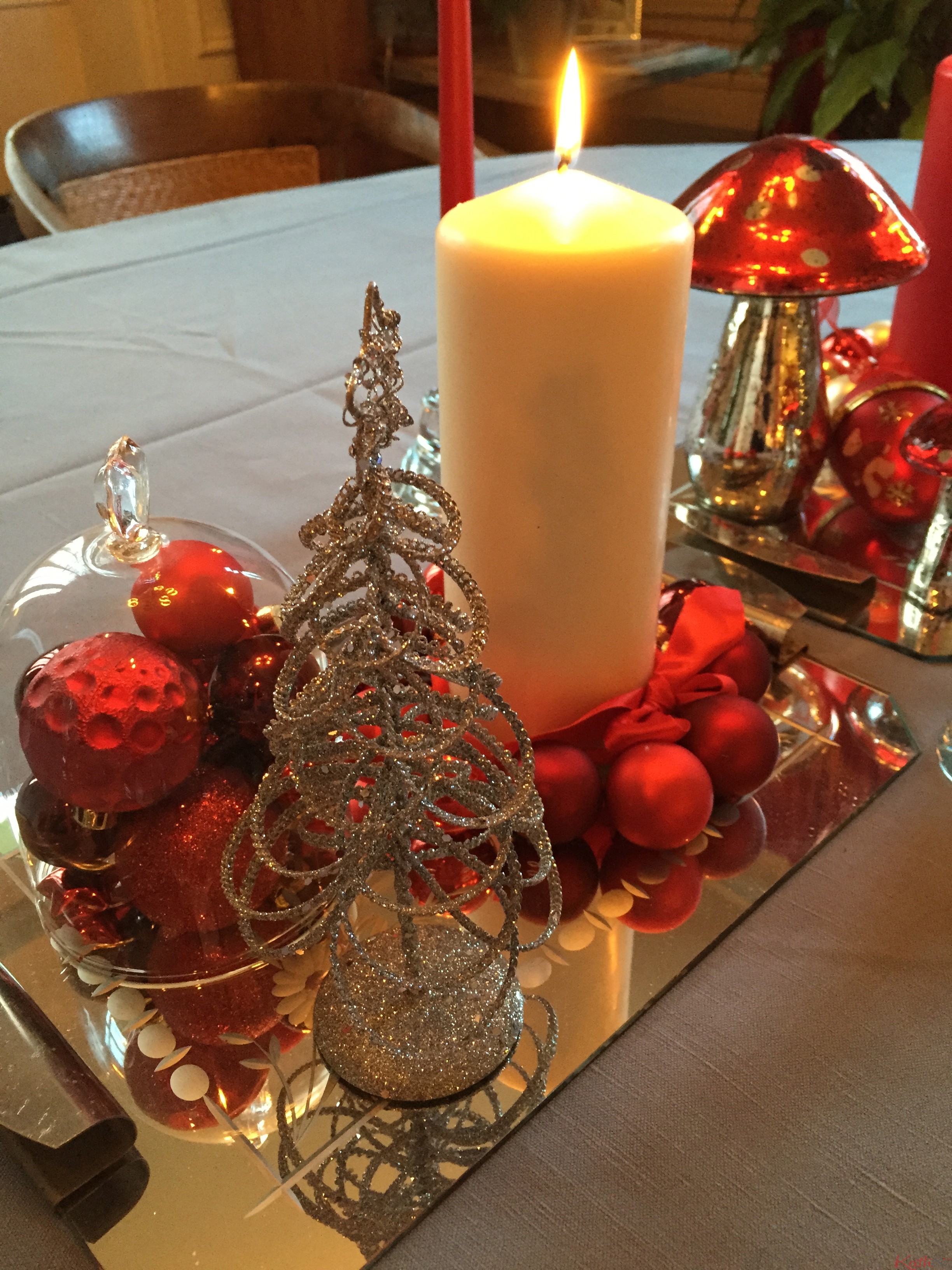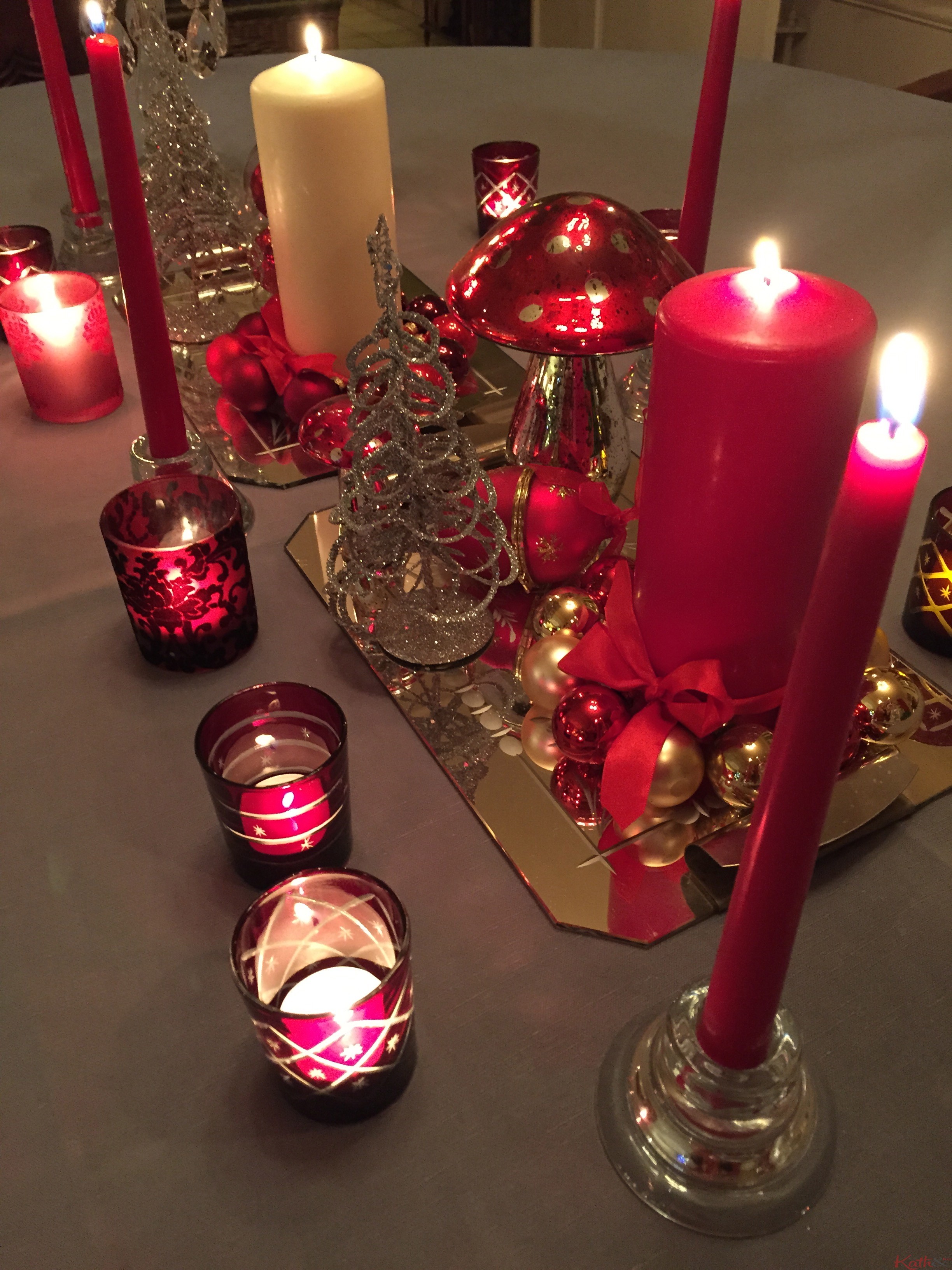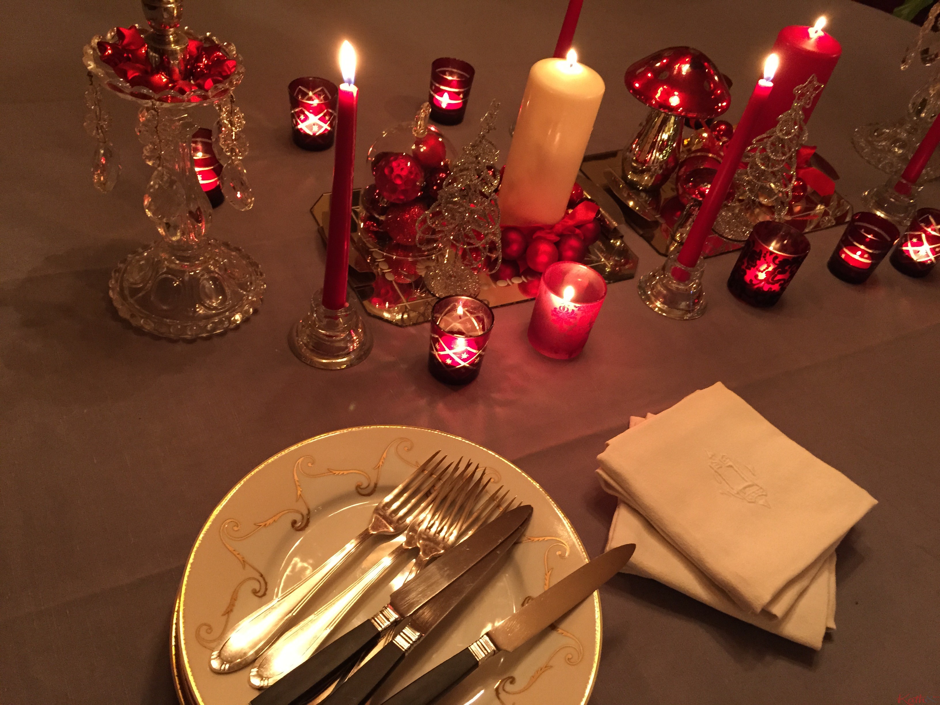Il reste maintenant la table de Noël à préparer, bien sûr on va sortir l’argenterie, les verres en cristal, la porcelaine, les serviettes et la nappe de mamie, on va mettre les petits plats dans les grands, mais une petite touche perso la rendra unique et inoubliable .Un peu d’imagination par ci, un peu de bricolage par là, pas question de dépenser des cents et des milles mais juste de faire avec ce que l’on a.Ne coupez pas les cheveux en quatre, osez le chichi, le bling bling, le glamour, ne lésinez pas sur les quantités, faites dans le magique, dans le  grandiose (décorez des dizaines de petits pots de yaourt de mousse et de petites étoiles avec une bougie au centre, disposez sur la table des traines de lierre ponctuées de rubans rouges, des petits bouquets de houx, des branches de sapin plantées dans des bouteilles et entourées d’un lien rouge ) et faites pétiller les yeux des petits et des grands.