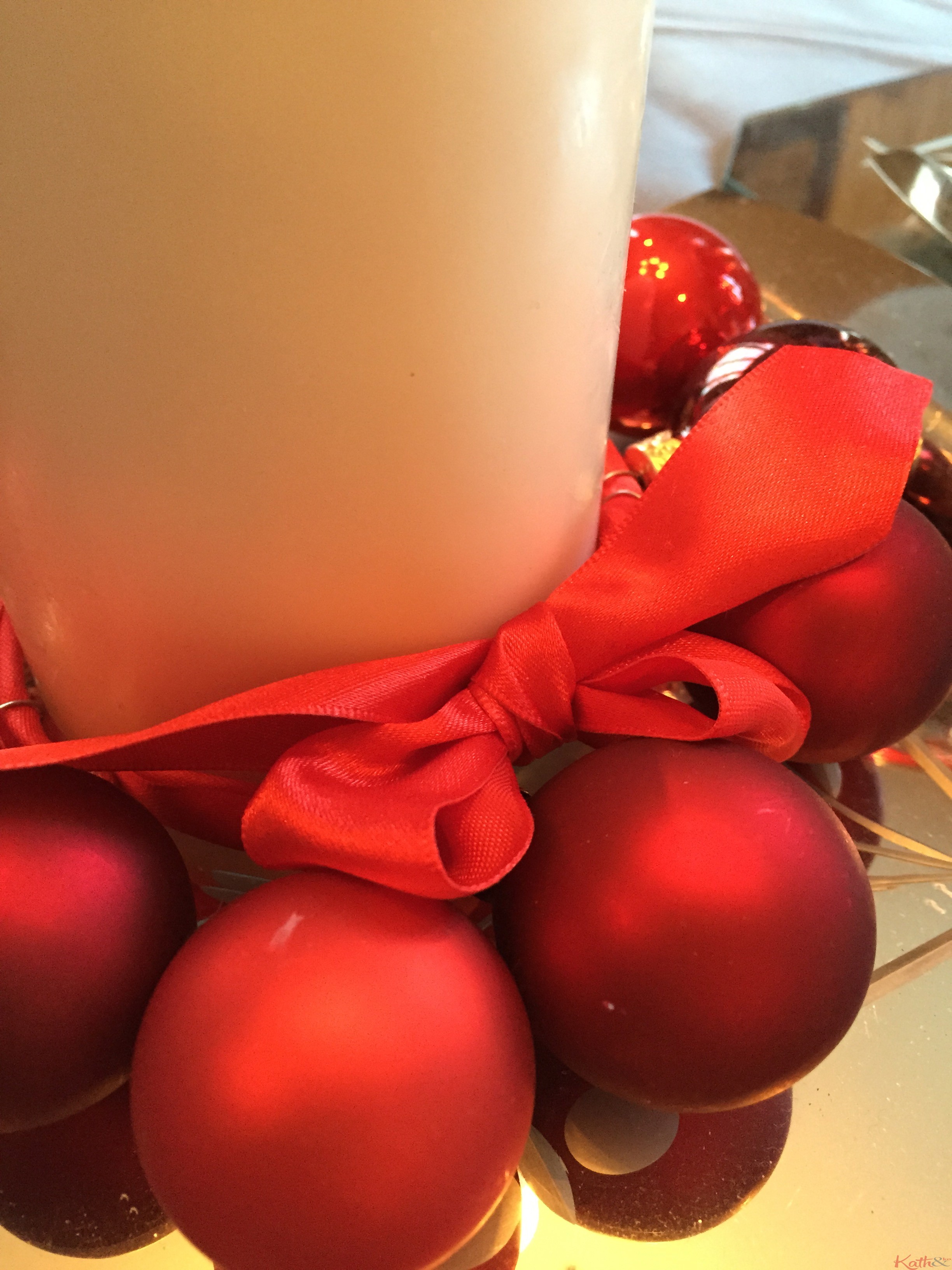 -Avec des mini couronnes faites de petites boules enfilées sur du ruban rouge et entourant des grosses bougies